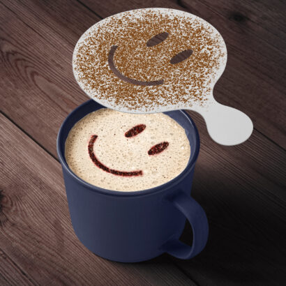 Just hold the stencil over your cup and sprinkle cocoa, cinnamon, matcha, or powdered sugar to transform your regular coffee into work of art.