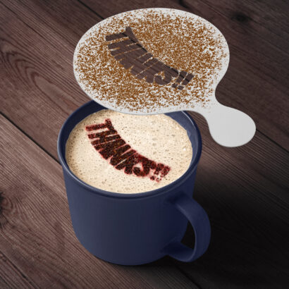 Just hold the stencil over your cup and sprinkle cocoa, cinnamon, matcha, or powdered sugar to transform your regular coffee into work of art.
