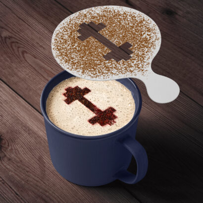 Just hold the stencil over your cup and sprinkle cocoa, cinnamon, matcha, or powdered sugar to transform your regular coffee into work of art.